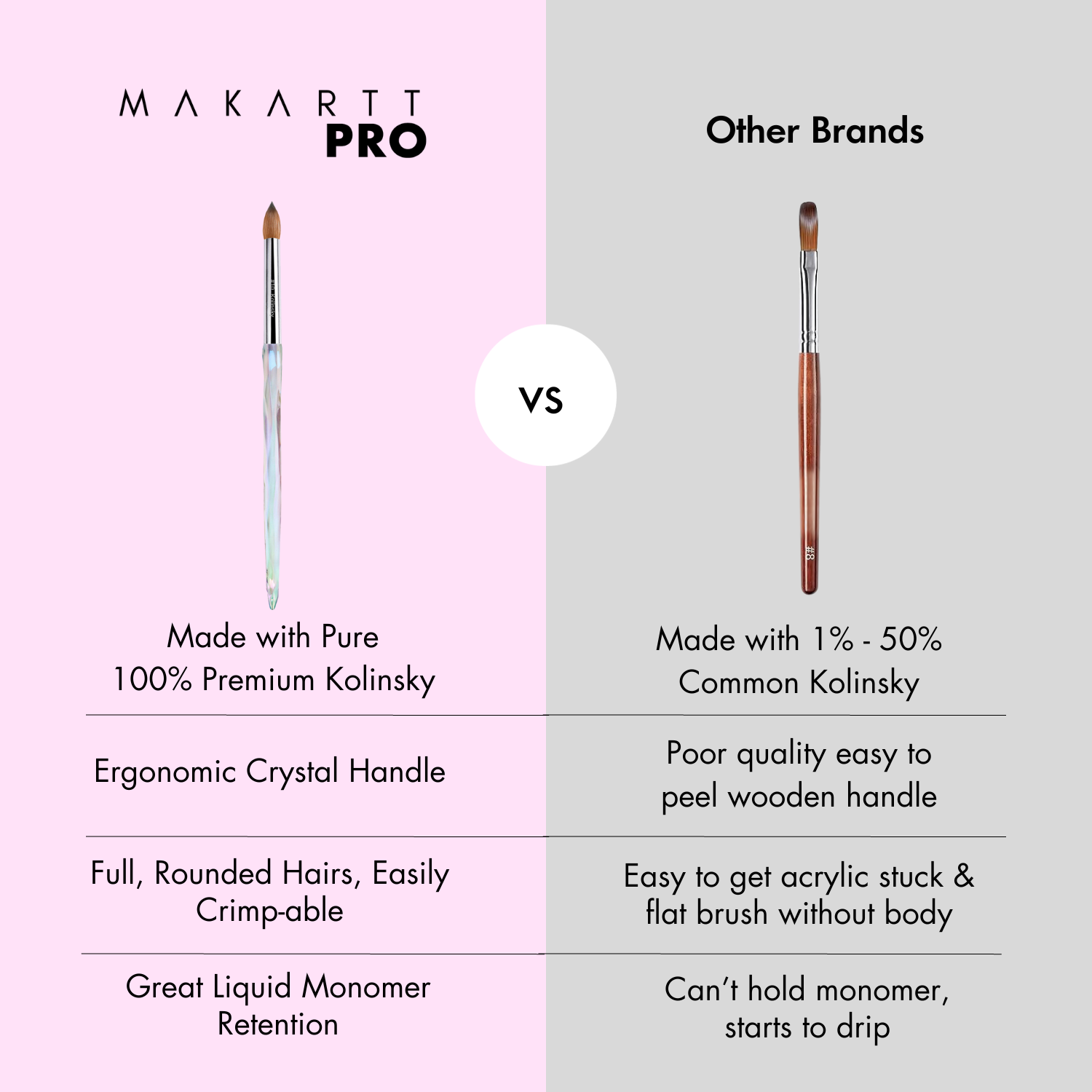 Introducing the enhanced 100% Kolinsky Acrylic Brush from MakarttPro, designed to elevate your acrylic application to a whole new level. Handmade with the finest quality of Kolinsky hair, this brush is perfect for a silky, smooth acrylic application. With proper care and maintenance, it can last for years, making it a worthwhile investment for every professional nail artist.